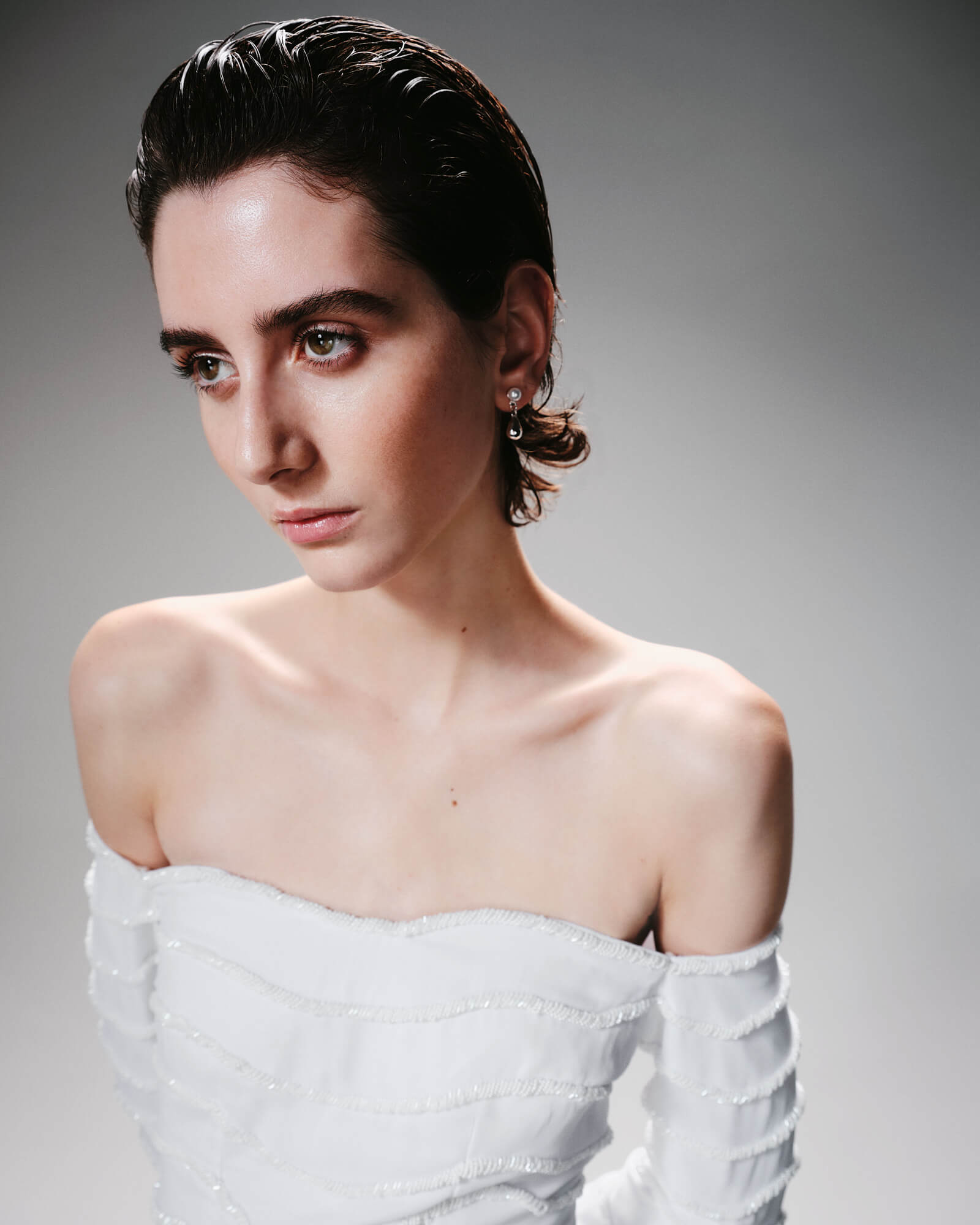 Off shoulder dress embellished with delicate beads and crystals arranged in a wave-like pattern.