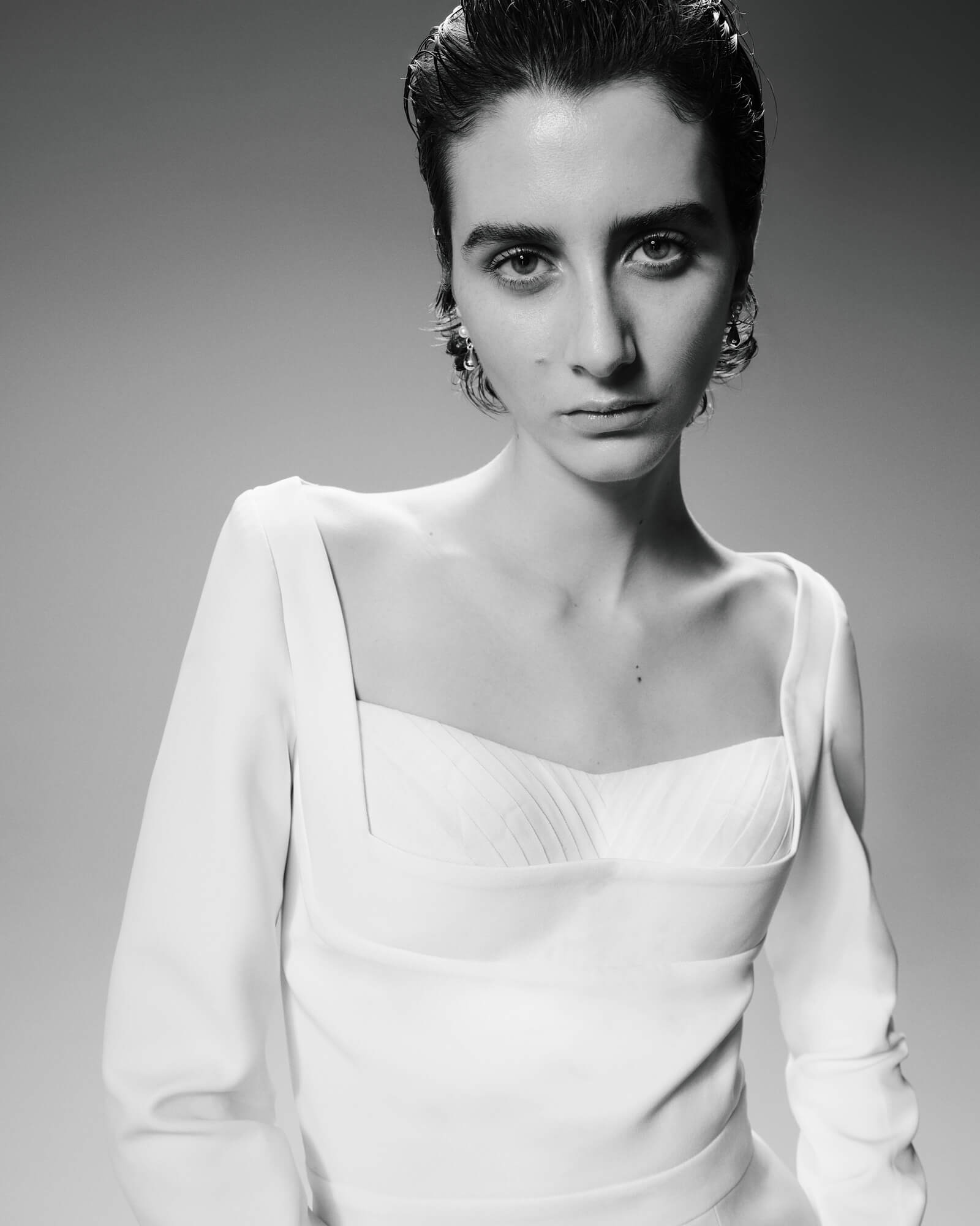 This set features a tailored silhouette with a delicately pleated bust design, adding dimension to its minimalist look. Paired with tailored flared trousers.